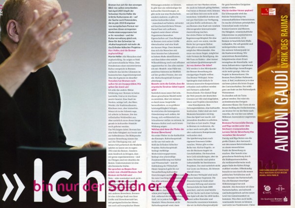 Jeden Tag zusammen mit anderen eine Kulturseite zu machen und nebenbei noch die Geschäfte eines kleinen Verlagshauses mit zu führen: Das war ein tages- und abendfüllendes Programm bei der taz bremen, der Regionalredaktion der »tageszeitung«. Trotzdem: Als »Die Zeit« und die »Süddeutsche Zeitung« ihre Magazinbeilagen einstellten oder in die Zeitung integrierten, schufen wir eine neue, denn die Nacht ist schließlich nicht allein zum Schlafen da. Okay, das Heft hatte einen etwas seltsamen Titel, aber es reifte mit jeder Ausgabe heran. Wirtschaftlich schrieb es eine dicke schwarze Null und ... musste dann doch zu früh beerdigt werden. Als Bremen später Kulturhauptstadt Europas werden wollte, lebte das Magazin verändert und mit neuem Titel wieder auf. Es machte einfach Spaß, mit guten Fotos und einer meiner Lieblingstypos ein Magazin zu gestalten. Bremen wurde nicht zur Kulturhauptstadt Europas 2010 gekürt, sondern Essen. Das schöne Magazin schläft seitdem zusammen mit seiner Mutter hinter einer Rosenhecke.